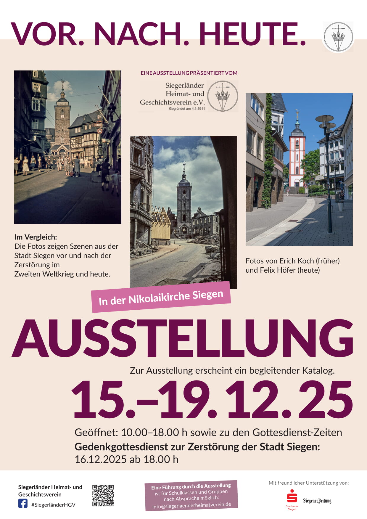 15 Stationen zeigen auf jeweils drei Fotos ein Detail der Siegener Innenstadt, aus exakt identischer Perspektive fotografiert, jeweils vor und unmittelbar nach dem Bombenangriff vom 16. Dezember 1944 sowie in unseren Tagen. Spüren Sie der Frage, „was wäre, wenn …?“, nach. Lassen Sie sich von Bildern vor der eigenen Haustür anrühren, von der unbarmherzigen Grausamkeit jedes Krieges.